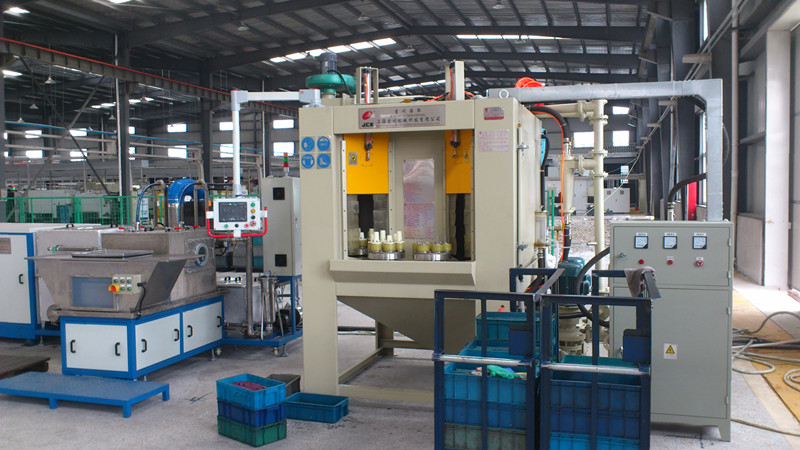 本设备是根据我公司针对蜗轮轴类产品和处理要求而专门设计的全自动转盘式湿式喷砂机,完全适合贵公司所提供的产品要求。根据贵对产品质量及效率的要求,本机共设置8个工件装夹位。大转盘每转动2个工位一停,喷砂舱布置喷砂枪